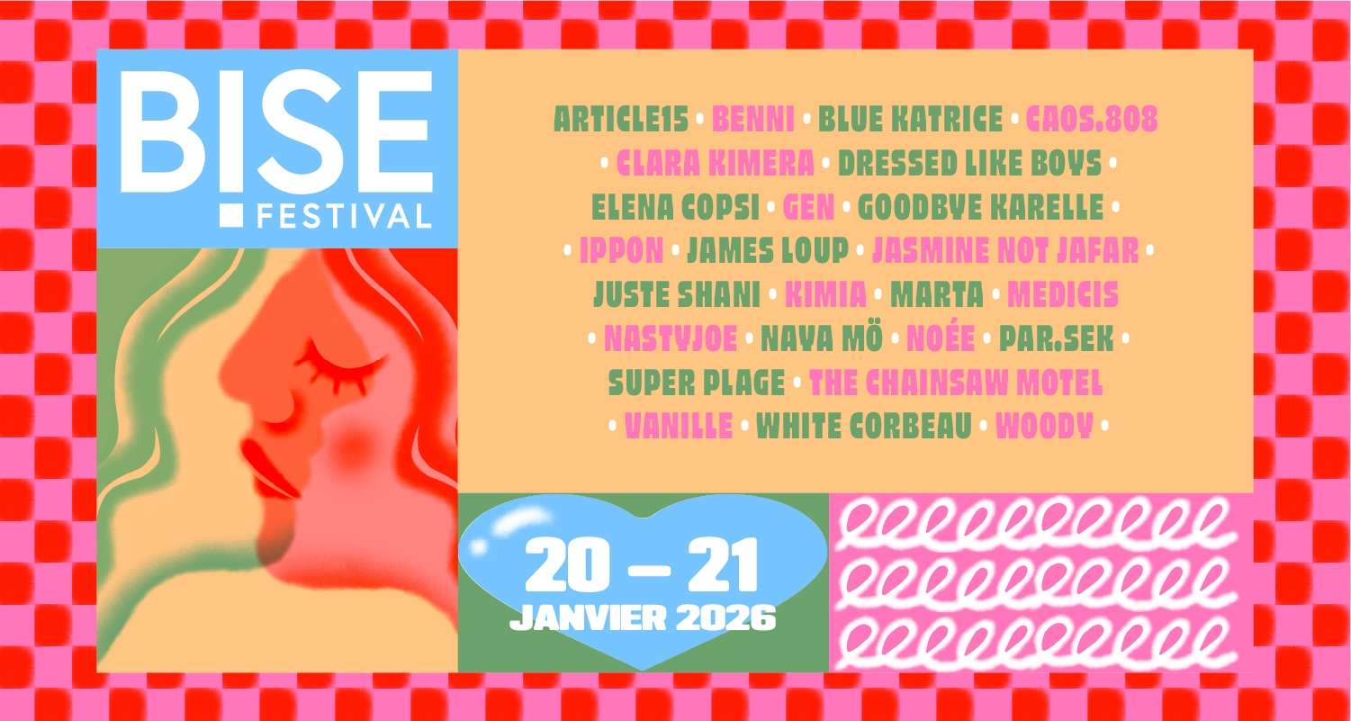 BISE Festival : Pass 2 soirs ARTICLE15 + Benni + Blue Katrice + caos.808 + Clara Kimera + Dressed Like Boys + Elena Copsi + Gen + Goodbye Karelle + Ippon + James Loup + Jasmine Not Jafar + Juste Shani + Kimia + Marta + MEDICIS + NASTYJOE + Noée + PAR.SEK + Super Plage + THE CHAINSAW MOTEL + Vanille + White Corbeau + Woody Mar. 20 Janv. 2026 Mer. 21 Janv. 2026
