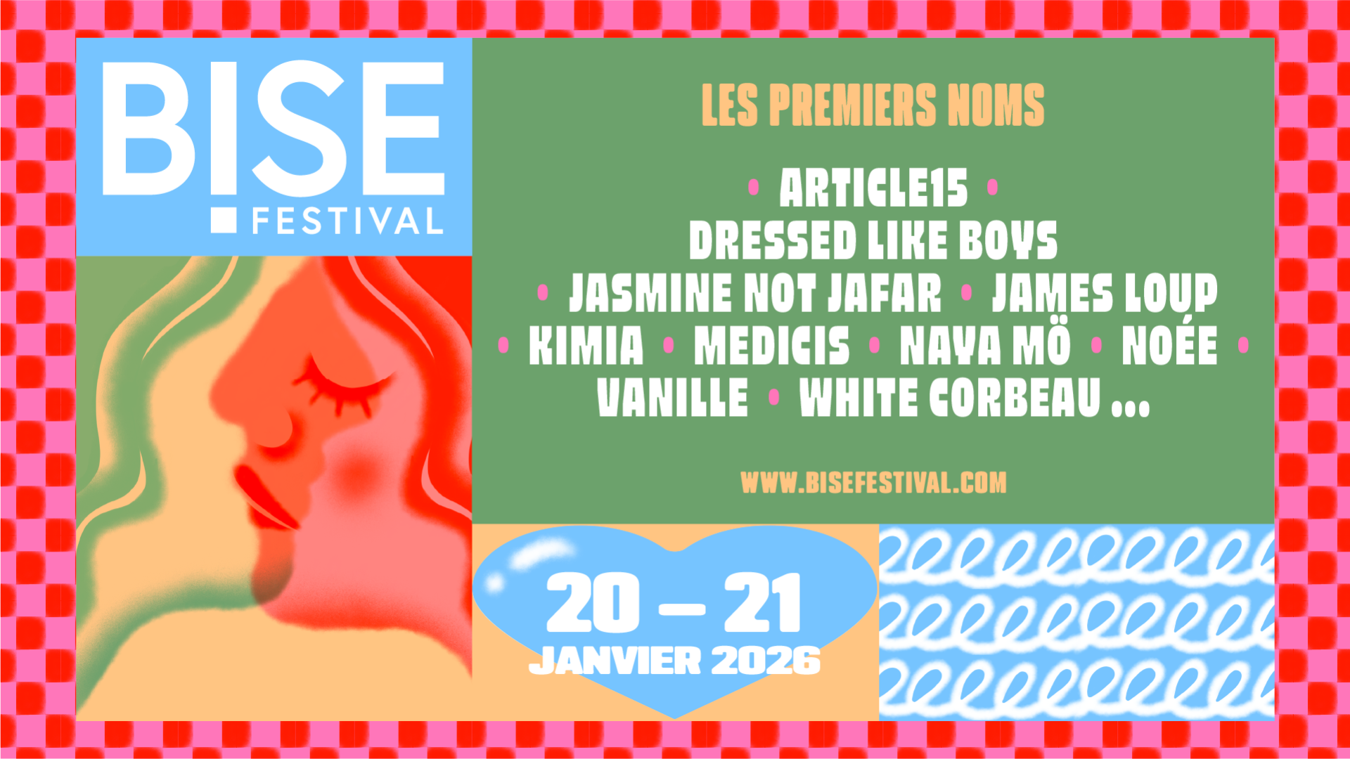 Mar. 20 Janv. 2026 Mer. 21 Janv. 2026 BISE Festival : Pass 2 soirs ARTICLE15 + Benni + Blue Katrice + caos.808 + Clara Kimera + Dressed Like Boys + Elena Copsi + Gen + Goodbye Karelle + Ippon + James Loup + Jasmine Not Jafar + Juste Shani + Kimia + Marta + MEDICIS + NASTYJOE + Noée + PAR.SEK + Super Plage + THE CHAINSAW MOTEL + Vanille + White Corbeau + Woody